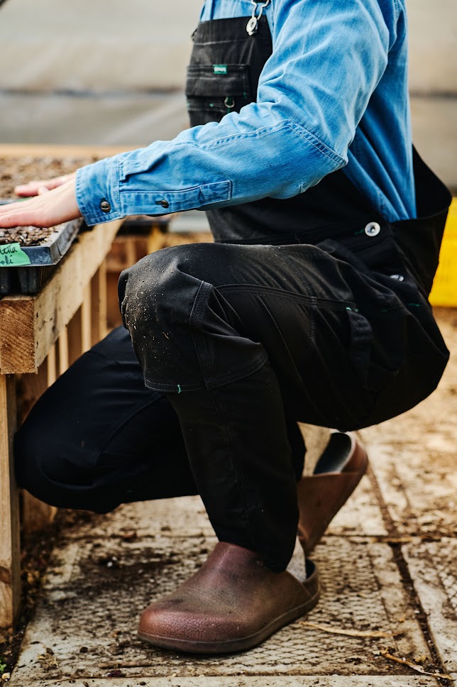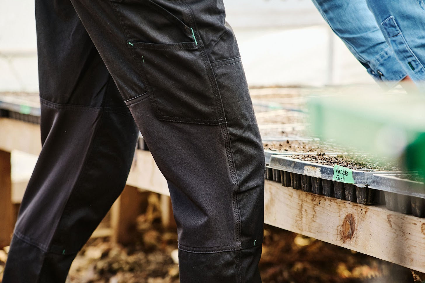 - Double-layer knee pockets for Growers & Co. knee pad addition